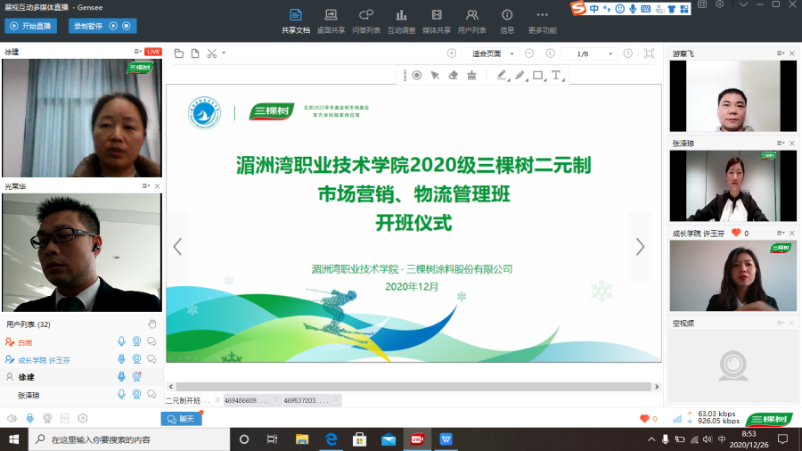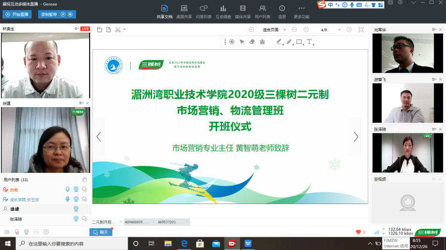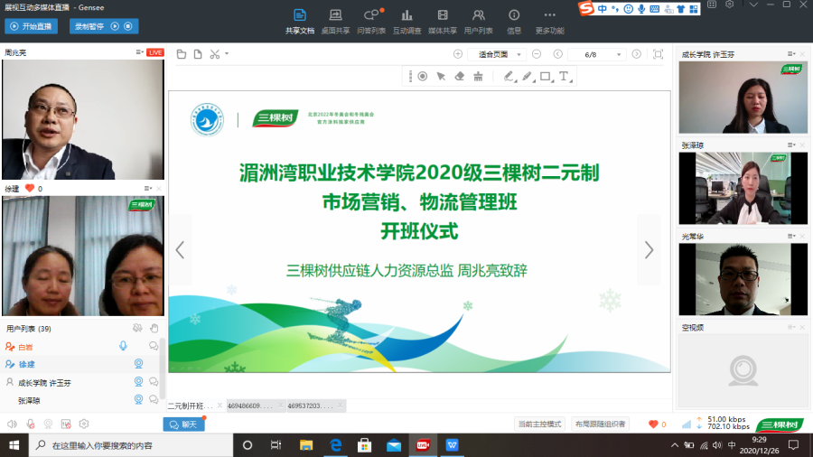 2020年12月26日上午,工商管理系举行湄洲湾职业技术学院2020级三棵树二元制(市场营销、物流管理)班线上开班仪式,两个专业41名学生、校企双方领导和老师齐聚线上,