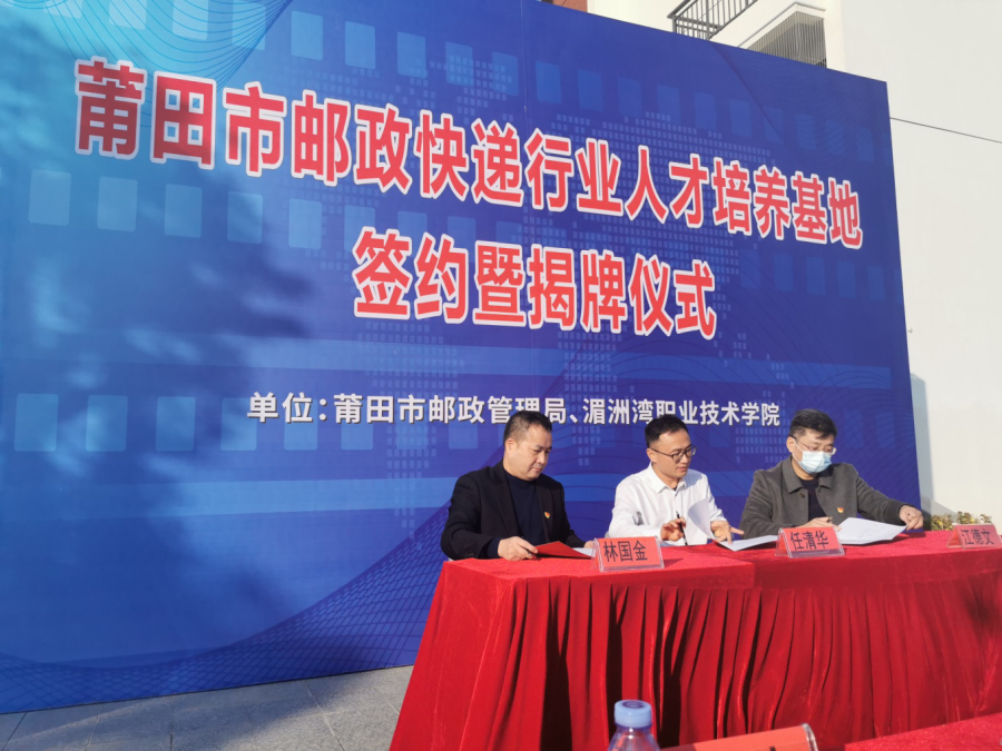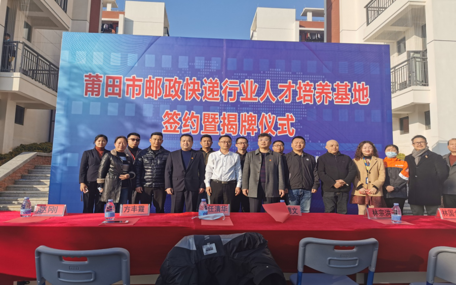 2020年12月30日下午3点30分,莆田市邮政管理局局长江德文、湄洲湾职业技术学院副院长任清华、工商管理系主任方丰霞、工商管理系党总支书记林宗洪、市快递行业协会会长、市顺丰速运公司赵刚总经理,以及各主要品牌快递企业负责人于湄职院物流快递点,举行莆田市邮政快递行业人才培养基地签约暨揭牌仪式。