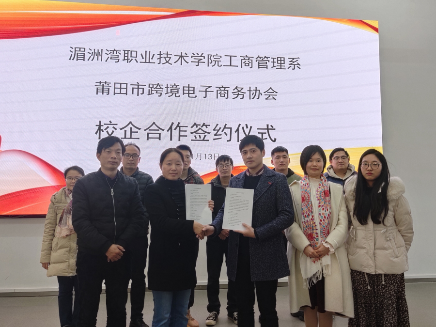 2021年1月13日下午3点20分,我系于信息楼中102举行工商管理系莆田跨境电商协会校企合作签约仪式。出席此次签约仪式的有系主任方丰霞、校企合作办主任徐建、跨境电商专业带头人周敏、跨境电商专业主任郭力菠、实训中心主任洪黎敏、跨境电商专业教师陈丽清、行政秘书朱晓宇、跨境电商协会会长戴光荣、秘书长戴益群、各企业代表以及跨境电商学生。
