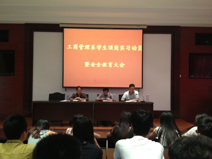 2013年7月26日下午3点,我系于图书馆学术报告厅召开“工商管理系学生顶岗实习动员暨安全教育大会”。参加这次会议的有:蔡元忠主任、陈凯书记、方丰霞副主任、洪慧贞辅导员以及参与本次实习的16位同学。