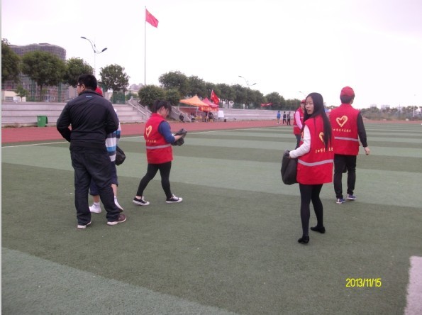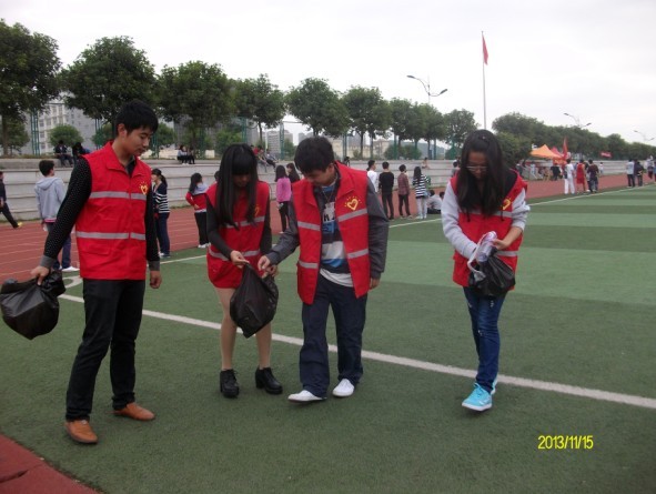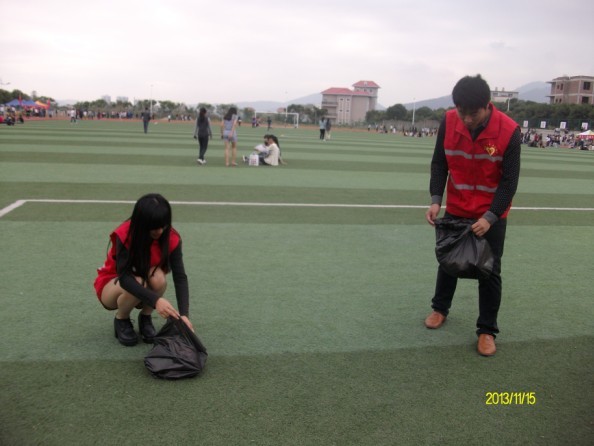 在我院维期两天的运动会期间,我系生劳部、宿管部身穿志愿者服装,自发清理整个操场,运动会期间同学们留下的瓶瓶罐罐和垃圾纸屑经过志愿者的