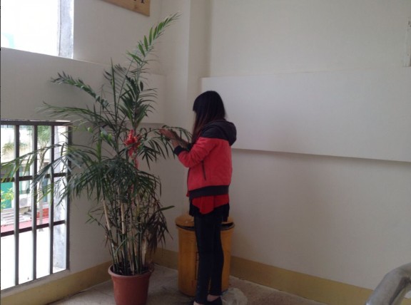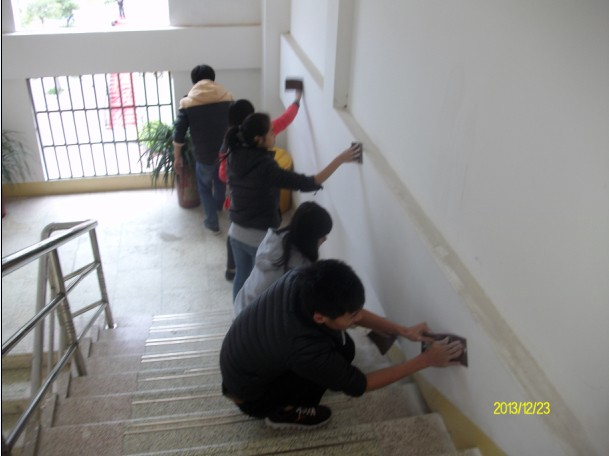 1223下午,我系全体预备党员放弃中午休息时间,携带劳动工具来到教学楼参加义务劳动。大家热情洋溢,舞动手中的砂纸,将墙壁上的脚印,口香糖残留物等不文明的污渍清理干净。