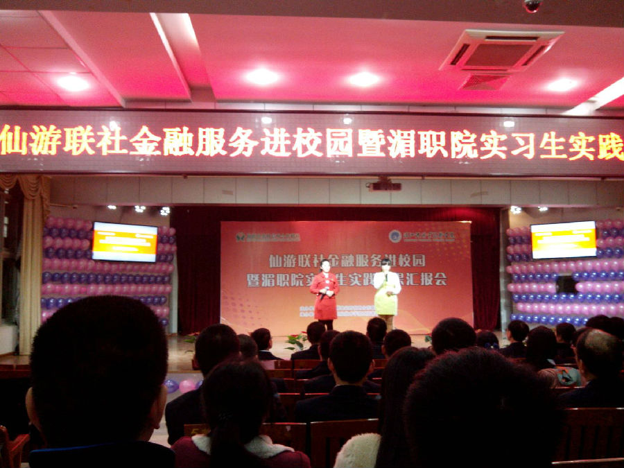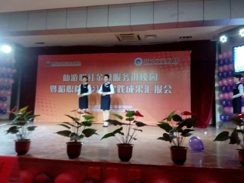 20131223日晚7点,仙游联社金融服务进校园暨湄职院实习生实践成果汇报会于17号楼201隆重举行。届时系主任蔡元忠、副主任方丰霞、书记陈凯担任本次汇报会的评委嘉宾。湄职校领导、工作人员及学生;仙游联社领导、机关全体工作人员、部分基层社主任及员工担任本次汇报会的考核人员。