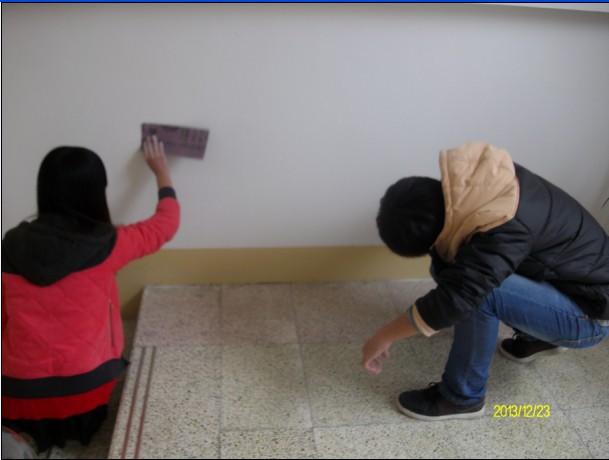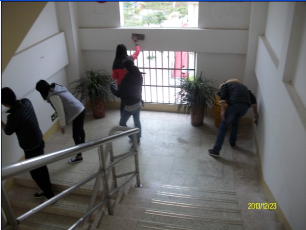 12月23日下午,我系全体预备党员放弃中午休息时间,携带劳动工具来到教学楼参加义务劳动。大家热情洋溢,舞动手中的砂纸,将墙壁上的脚印,口香糖残留物等不文明的污渍清理干净。