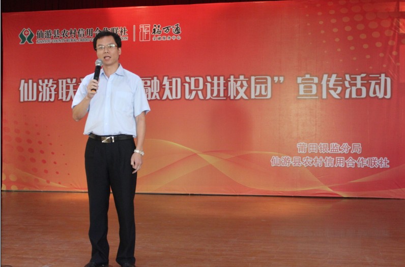 2014923下午3点,仙游联社在我院17#201开展“金融知识进校园”主题宣传活动,出席会议的有莆田银监分局团工委书记阮宇、仙游县信用社理事长林向前、我院主任蔡元忠、副主任刘伟、以及我院13级会计专业生。