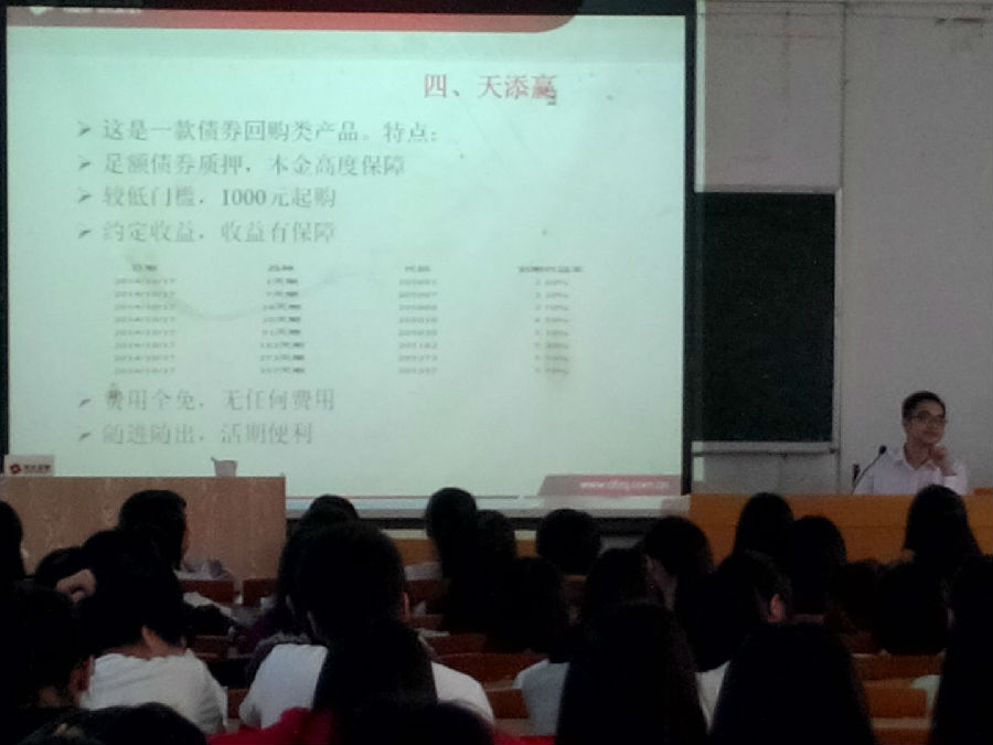 宣讲会上,东方证券有限公司负责人肖剑曦以如何培养理财意识、理财产品的简介,就业前准备以及东方证券简介等四个议程展开活动,并提出 “越没钱越要理财,你不理财,财不理你。”的观点。宣讲其间还开展了一系列有关理财知识的互动环节,肖剑曦用幽默风趣的言语解答了同学们提出的问题。宣讲会为同学们树立正确的理财观起了积极的作用。