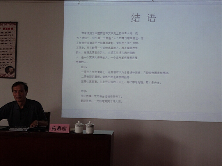 6月2日下午,工商楼401室座无虚席,学院党委副书记、纪委书记施春耀到我院为两委会全体学生会干部开讲座,他以《东坡风范耀古今》为题,以大学生廉洁自律与道德修养教育为主旨,给同学们带来了精彩一课。讲座由我院党总支副书记陈志君主持。