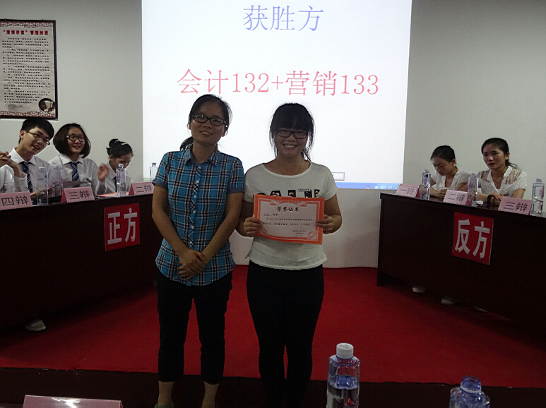 当晚,闯入本次辩论赛总决赛的两支辩队分别是会计132与营销133联队和会计143队。他们的决赛辩题为“大学生创业应该遵循已有的成功经验还是应该另辟蹊径独创经营模式”。因为双方参辩同学准备充分,再加上前几场比赛中积累了丰富的经验和辩论技巧,双方辩手在决赛中发挥出前所未有的水平。经过激烈的交锋,会计132与营销133联队发挥出色,赢得了观众和评委的一致好评,摘取了本次辩论赛总决赛的桂冠,一路过关斩将的会计143队屈居次位。本场的最佳辩手则被反方三辩邱清同学夺得。
