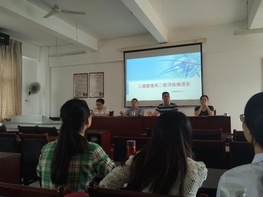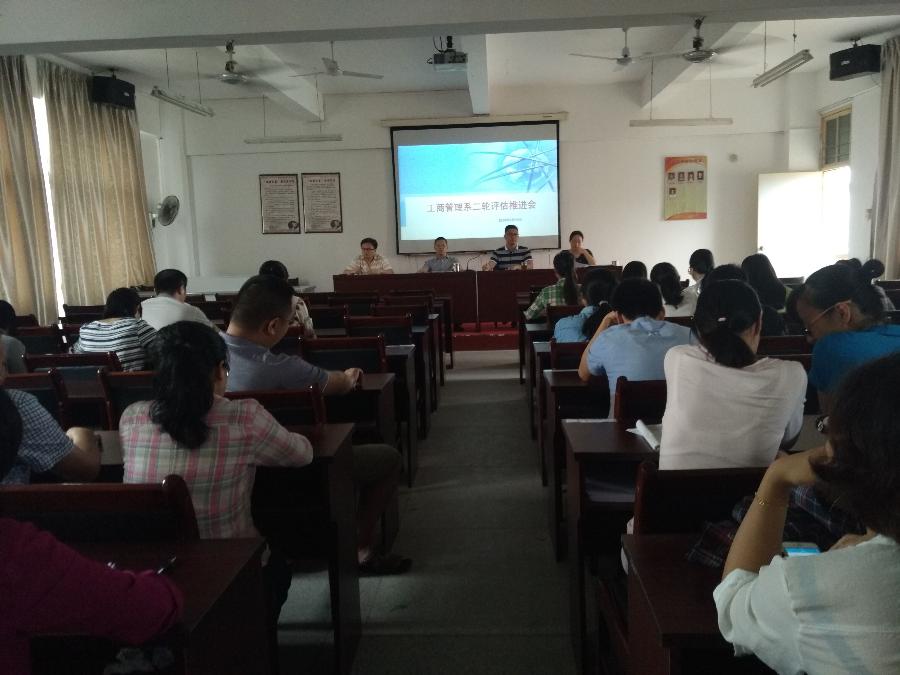 5月10日下午,我系在25号楼401室召开二轮评估推进会。出席会议的有工商系主任蔡元忠、党总支书记陈凯、副主任方丰霞、刘伟、各教研室全部教师,会议由陈凯书记主持。