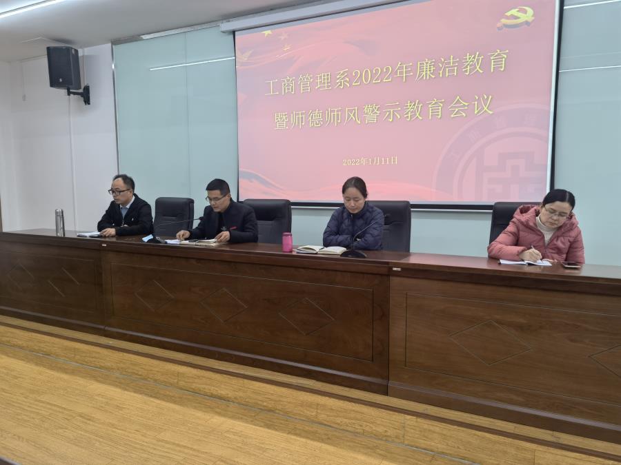 为深入贯彻落实中央纪委国家监委、省市纪委监委及学院纪委相关文件要求,加强我系作风建设和廉洁自律工作。2022年1月11日,我系于行政楼南403召开廉洁教育暨师德师风警示教育会议。工商管理系全体教师参会,会议由工商管理系党总支副书记许志敏主持。