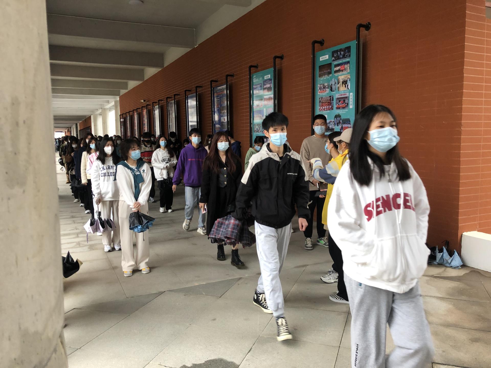 上午800整,待检人员分批次到指定的等候区候检。本次核酸每10人为一组,依次排队接受采样。检测现场严格落实疫情防控要求,全体人员全程佩戴口罩间隔1米,分时段、分批次,陆续进入等候区和采样区。上午830,检测工作正式开始。检测前,入党积极分子以及党员志愿者一起认真核对学生采样码,确保信息准确无误后由医护人员逐个为学生采集咽拭子。采样结束后,在志愿者引导下完成消毒手掌工作后迅速离开现场。虽然此次全面核酸检测人数较多,但在各方配合下,整个过程有条不紊、忙而有序,在预定时间内高效率、高质量完成全员采集任务。