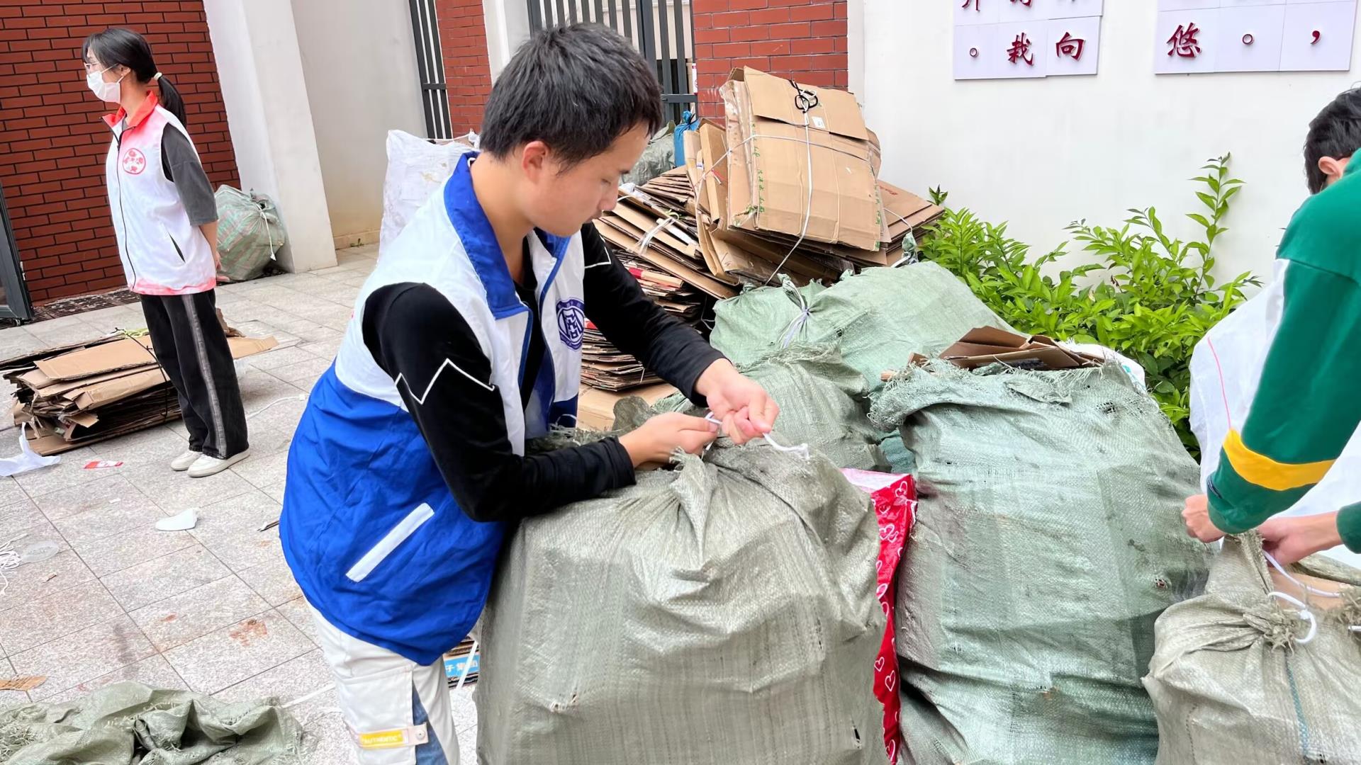 在活动现场中,志愿者先指挥同学们有序排列好队伍,再依次对每个同学手中装满纸皮、塑料制品的网袋进行称重并详细记录。随后陈云老师带领志愿者们将收集的各类物品按要求叠放整齐、统一归置在指定位置,最后一齐运上装置车。现场志愿者们认真高效,全身心地投入到垃圾分类活动中,也展现出了我系学子的良好精神风貌。