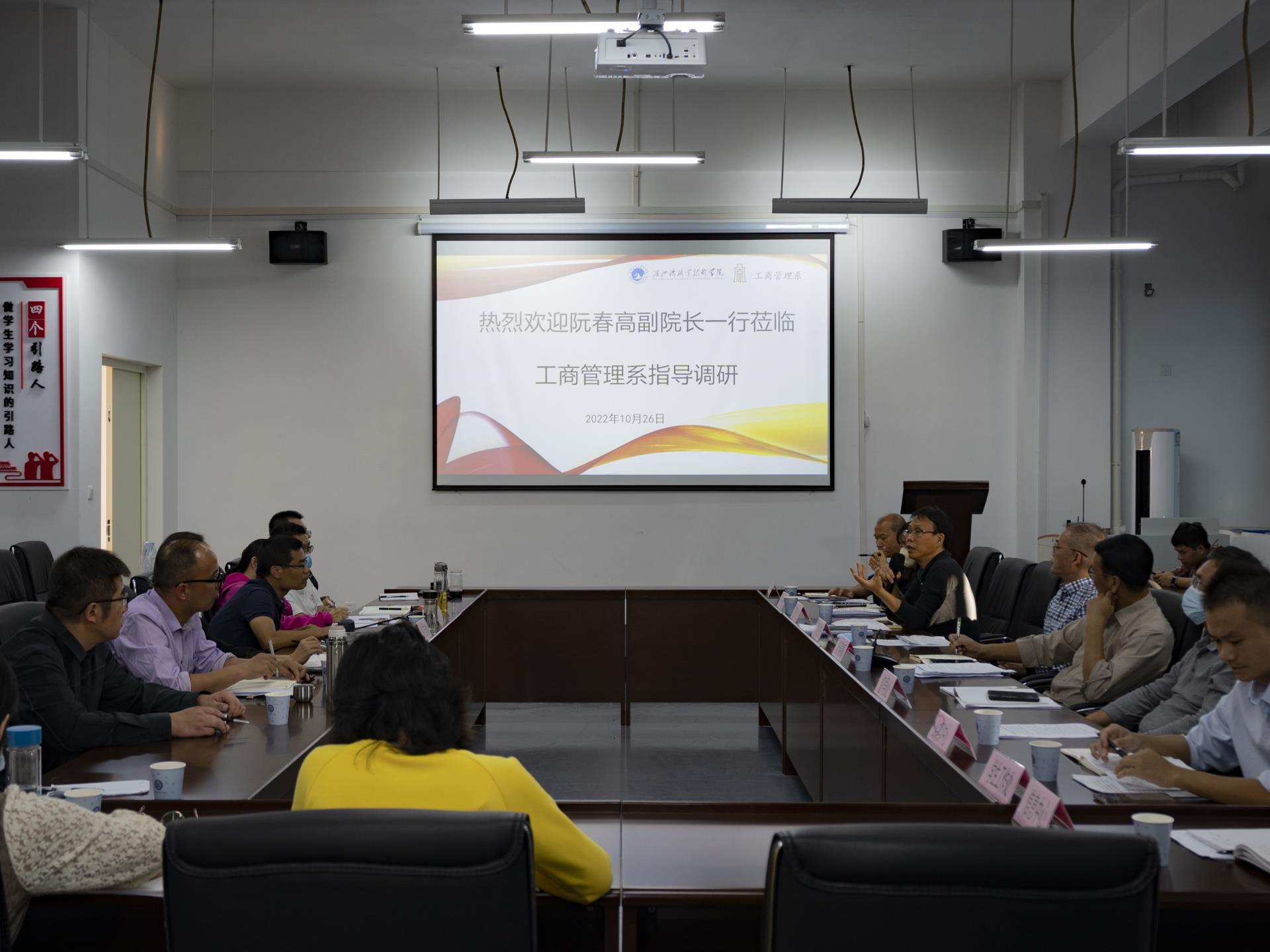2022年10月26日下午三点,湄洲湾职业技术学院阮春高副院长一行莅临工商管理系指导调研,质量发展处、督导处、教务处等职能部门负责同志陪同调研。工商管理系主任方丰霞、系党总支副书记许志敏、系副主任徐建,黄智萌、各教研室主任、实训中心主任、总辅导员、行政秘书等出席会议。
