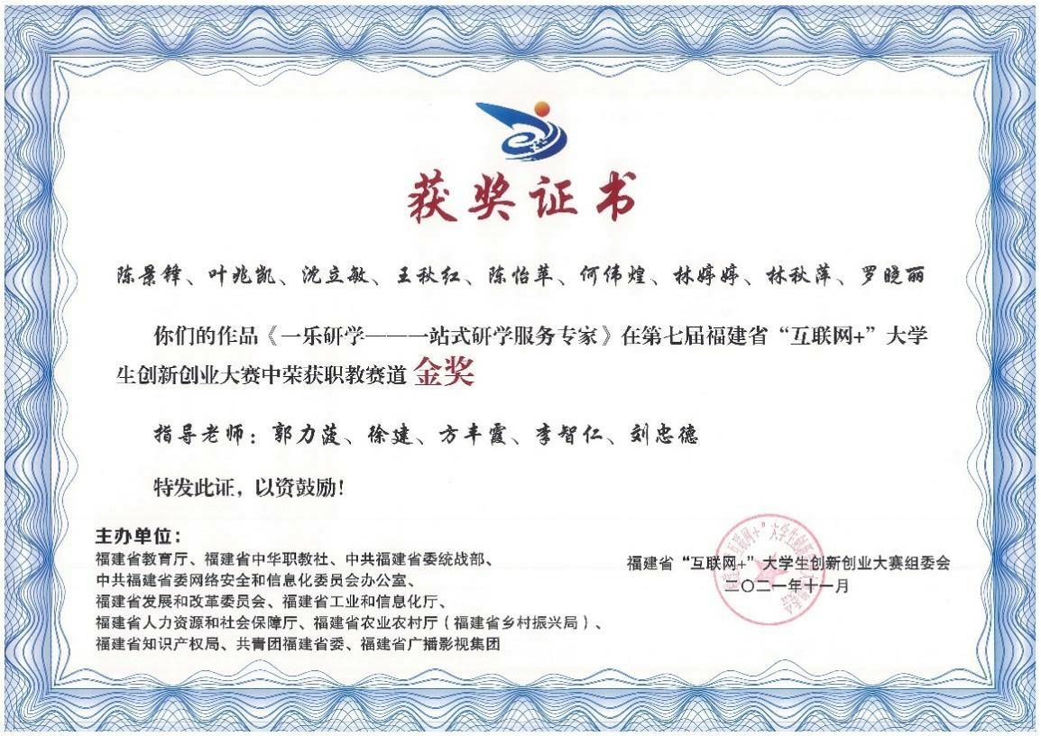 2021年第七届福建省“互联网+”大学生创新创业大赛省赛金奖、银奖、铜奖各一项;