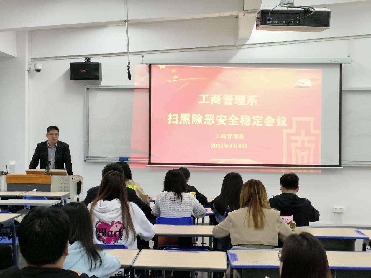 为推进平安校园建设,扎实做好学生安全教育工作。工商管理系于4月6日在公教二北402召开扫黑除恶安全稳定会议。出席本次会议的有我系党总支副书记黄智萌、学工办主任李海铭、辅导员以及学生干部。