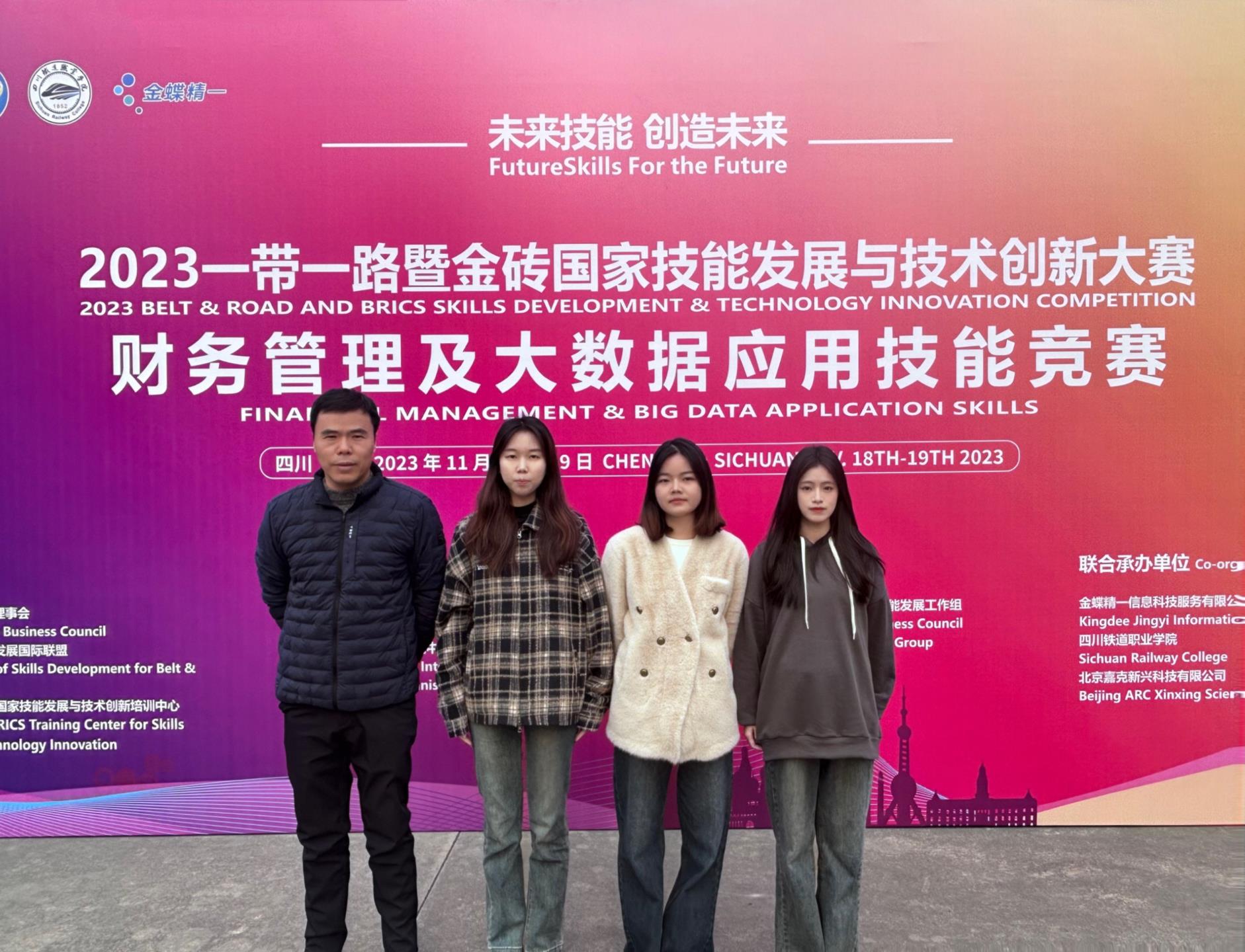 2023年11月19日,由金砖国家工商理事会、一带一路暨金砖国家技能发展国际联盟和中国科协一带一路暨金砖国家技能发展与技术创新培训中心共同主办的“财务管理及大数据应用技能竞赛”在四川铁道职业学院举行,我院工商管理系大数据与会计专业的张丽招,刘彤和李晨鑫三位同学,在指导老师的带领下前往参赛,本赛事指导老师是郑宗旭,陈丽琴。